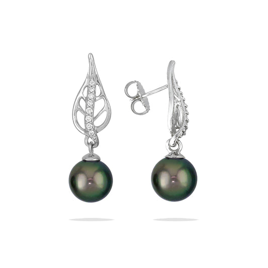 Tahitian Pearl Maile Leaf Earrings with Diamonds, 9mm