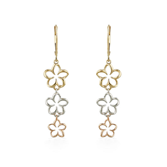 Tri-Color Three Floating Plumeria Drop Leverback Earrings