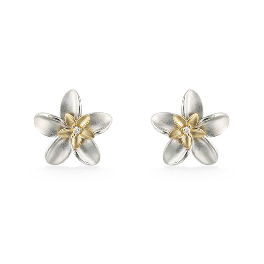 Silver and Gold Double Plumeria Stud Earrings with Diamonds