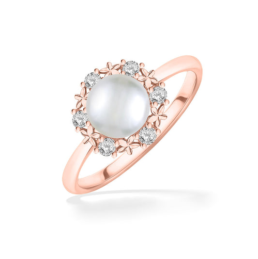 Pua Lei Ring with Akoya Pearl and Diamonds, Size 7