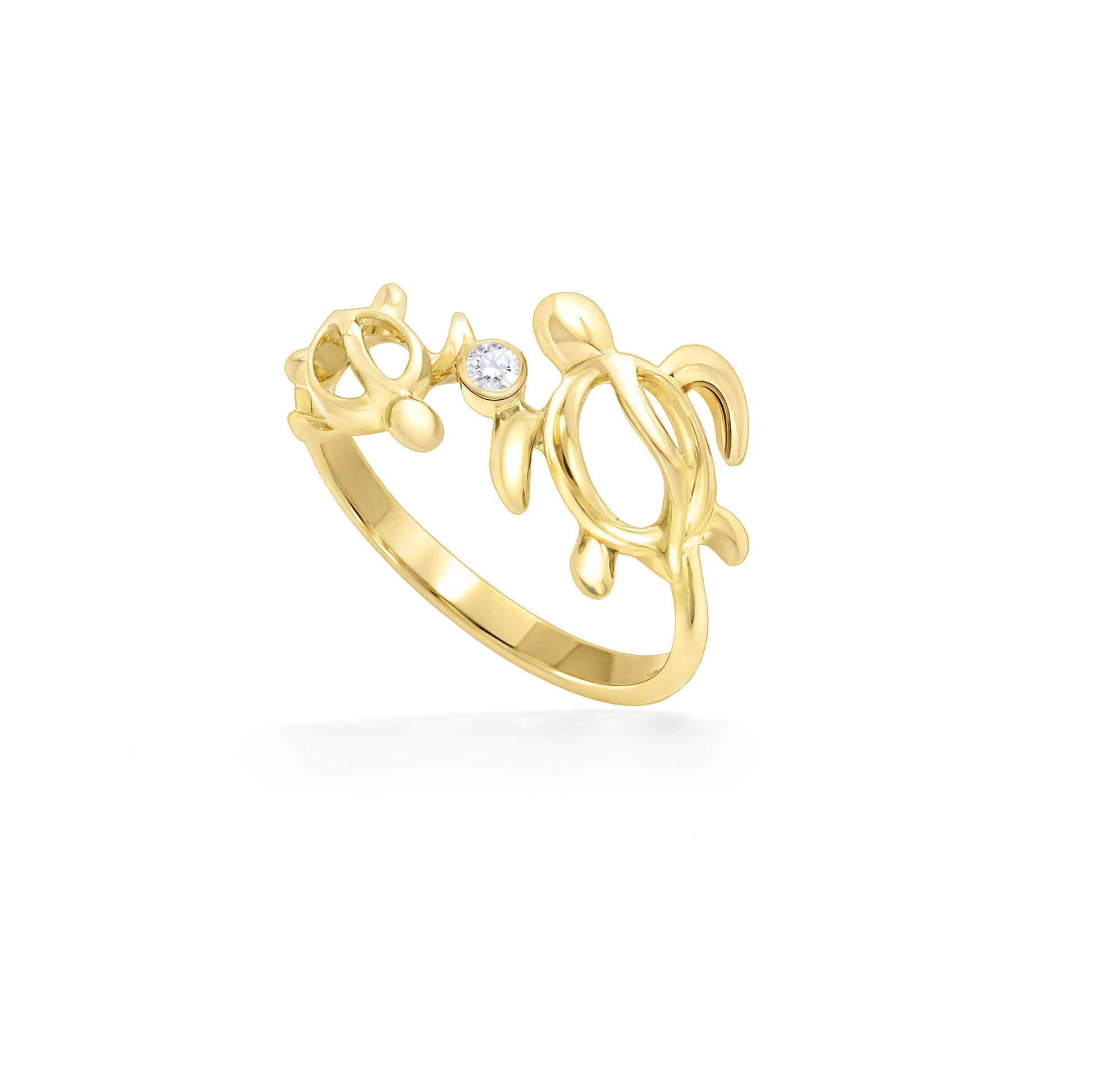 14K Yellow Gold Double Honu Ring with a 0.03 Carat Diamond.