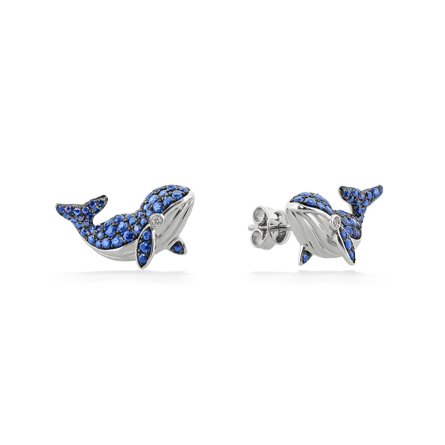14K White Gold Effy Whale Stud Earrings with 0.86 Carats (total weight) of Blue Sapphires and 0.01 Carats (total weight) of Diamonds in the eyes. The earrings measure approximately 11/16" in length, from head to tail.