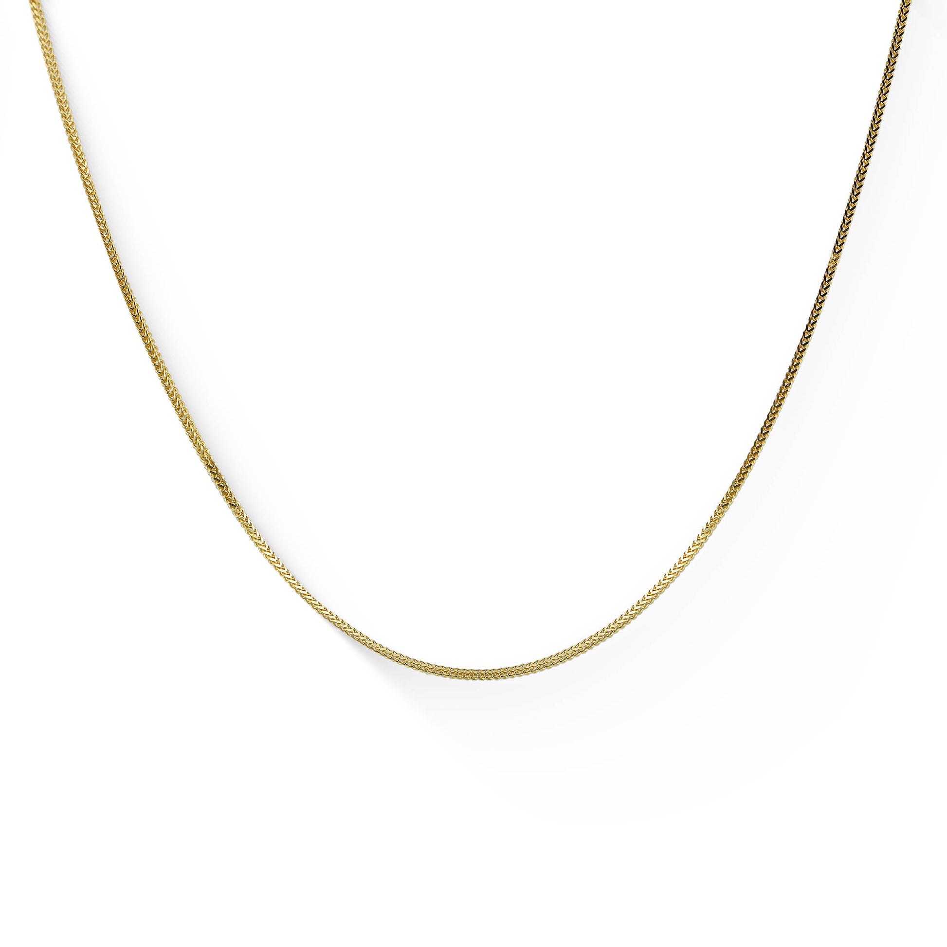 14K Yellow Gold Foxtail Mesh Chain. The chain measures approximately 16" in length and approximately 0.8mm in width.