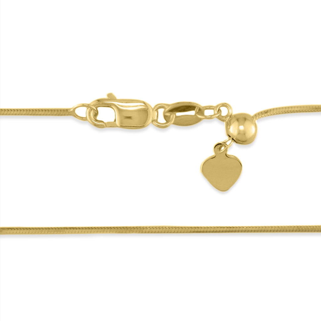 14K Yellow Gold Adjustable Snake Chain. The chain adjusts up to 22" in length and measures approximately 0.80mm in width. Please note that the chain may include an oval-shaped plate rather than a heart-shaped plate, depending on item availability.