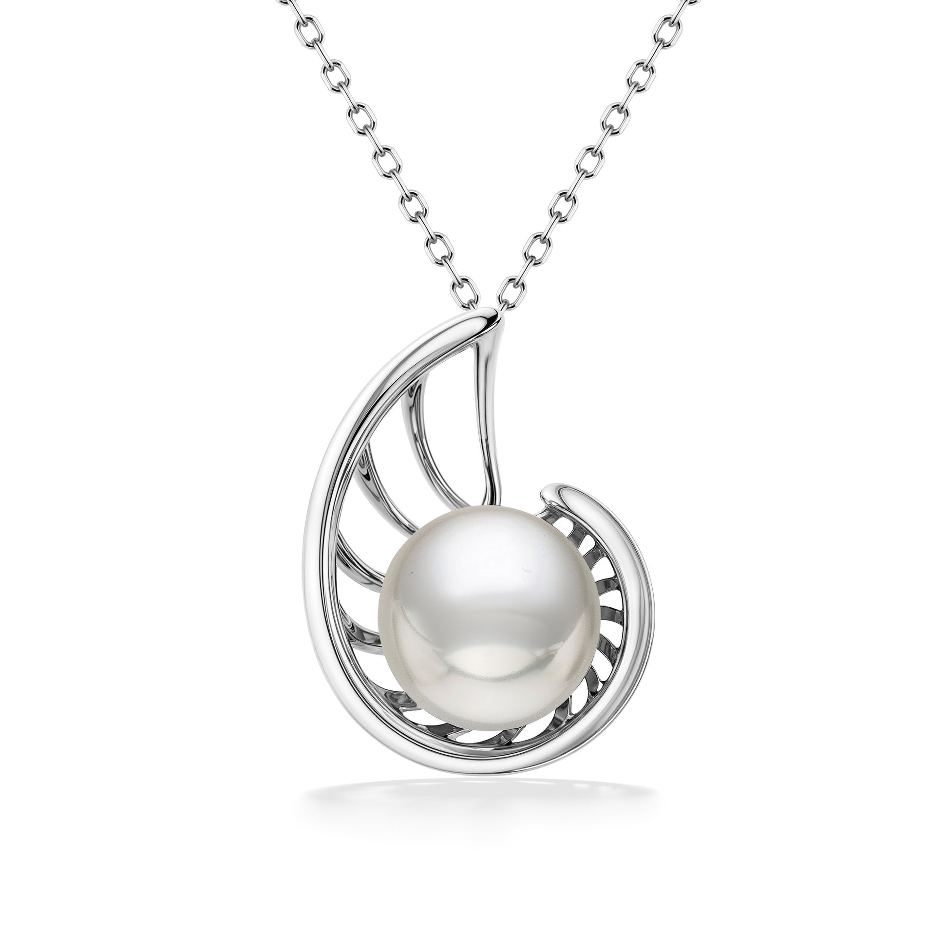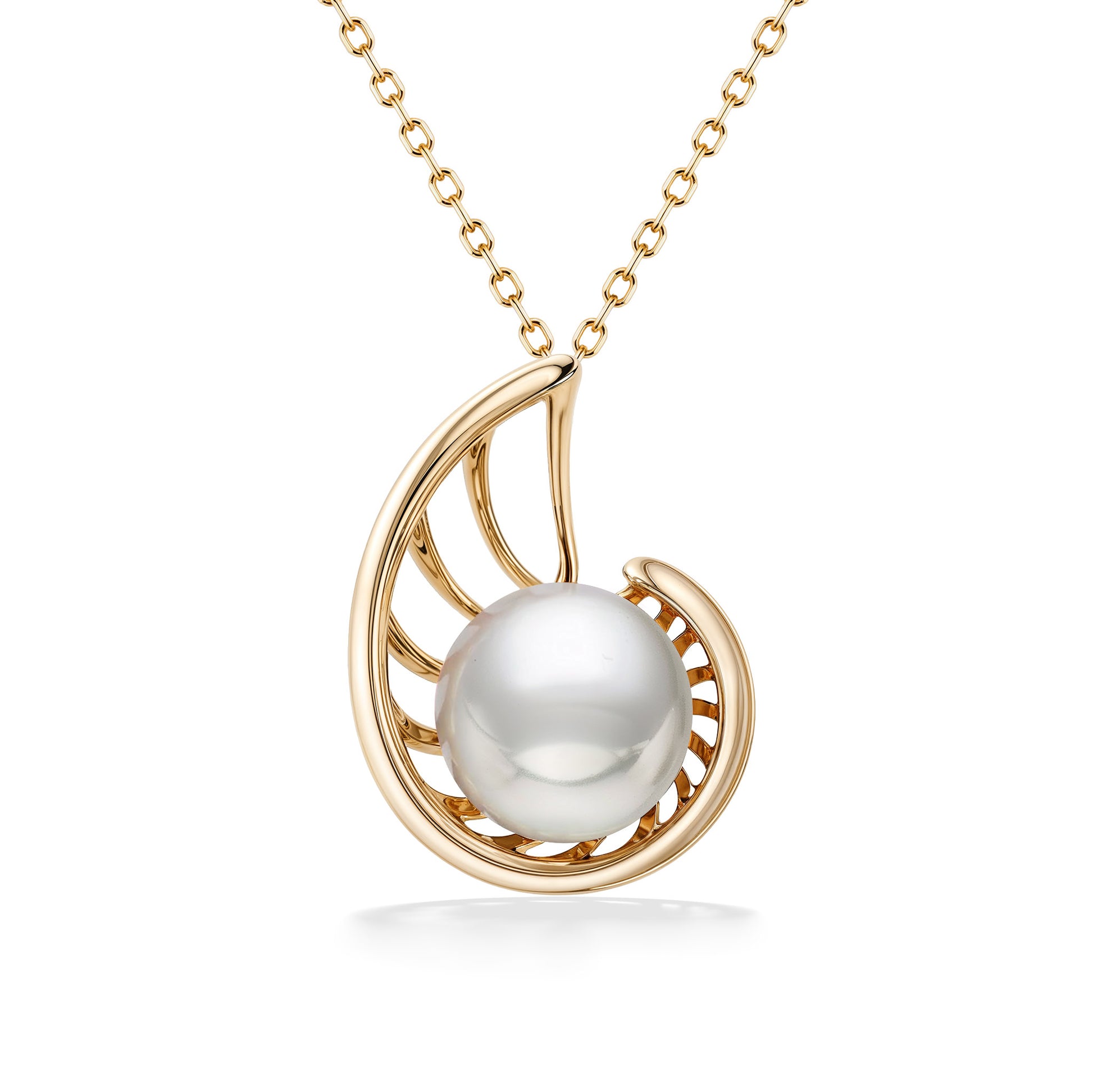 14K Yellow Gold Nautilus Pendant with a 7mm White Akoya Pearl. 17" 14K Yellow Gold Chain included. The pendant measures approximately 3/4" in length and approximately 1/2" in width.