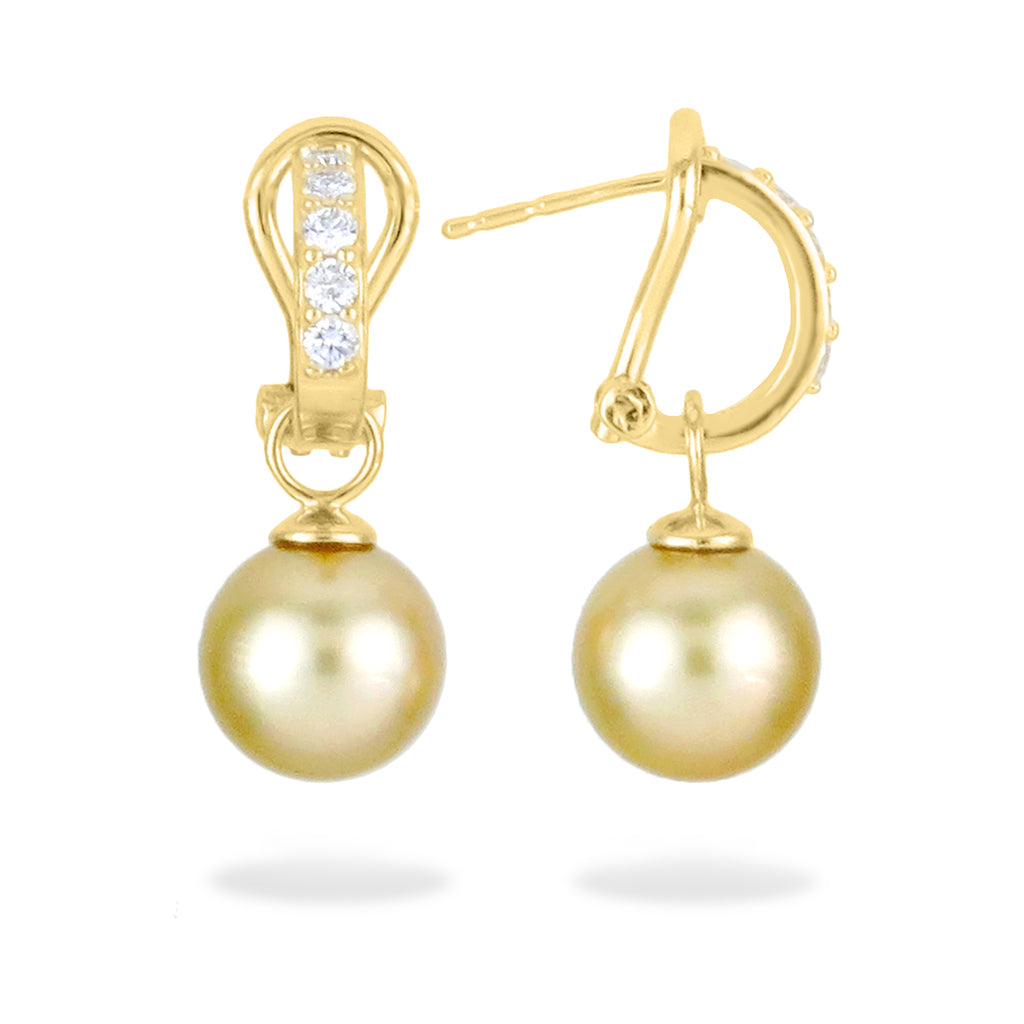 14K Yellow Gold Hooplet Earrings with 9-10mm Golden South Sea Pearls and 0.30 Carats (total weight) of Diamonds and Omega backings. The Diamond Hooplets can also be worn without the pearl add-on. The earrings measure approximately 1" in total length. The Diamond Hooplets measure approximately 1/2" in length.