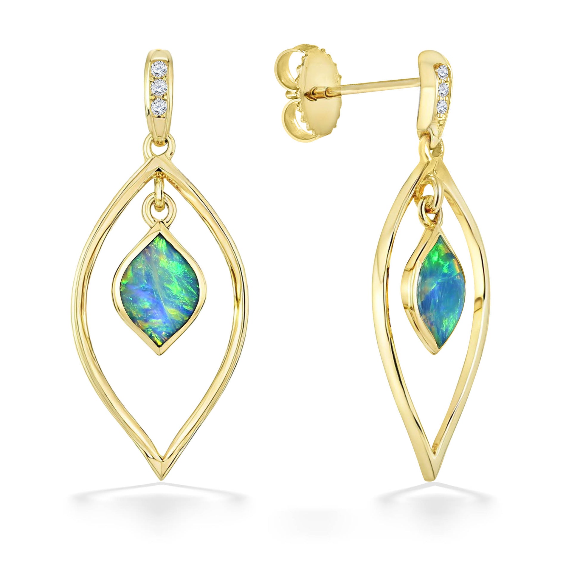 14K Yellow Gold Kabana Drop Earrings with Opal Inlay and 0.04 Carats (total weight) of Diamonds. The earrings measure approximately 1 1/4" in total length.