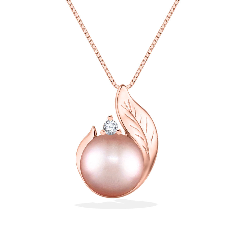 14K Rose Gold Maile Pendant with a 7mm Natural Pink Button Freshwater Pearl and a 0.02 Carat Diamond. 17" 14K Rose Gold Chain included. The pendant measures approximately 9/16" in length.