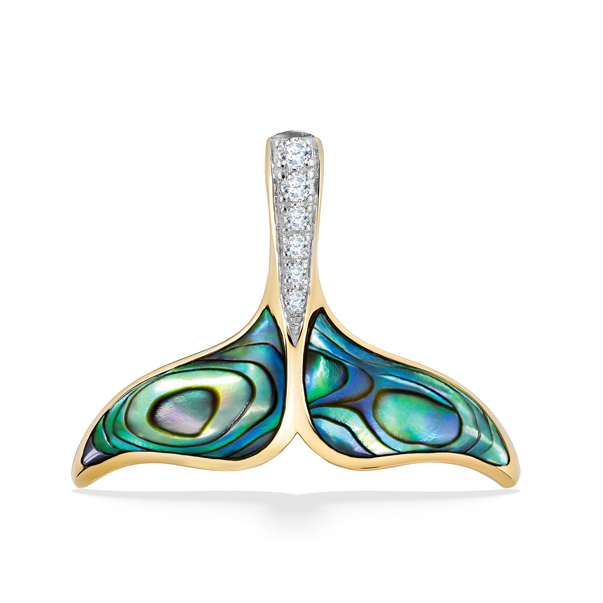 14K Yellow Gold Whale Tail Pendant with Abalone Inlay and 0.10 Carats (total weight) of Diamonds. The pendant measures approximately 1" in width. Please note that a chain is not included with the purchase of this pendant.